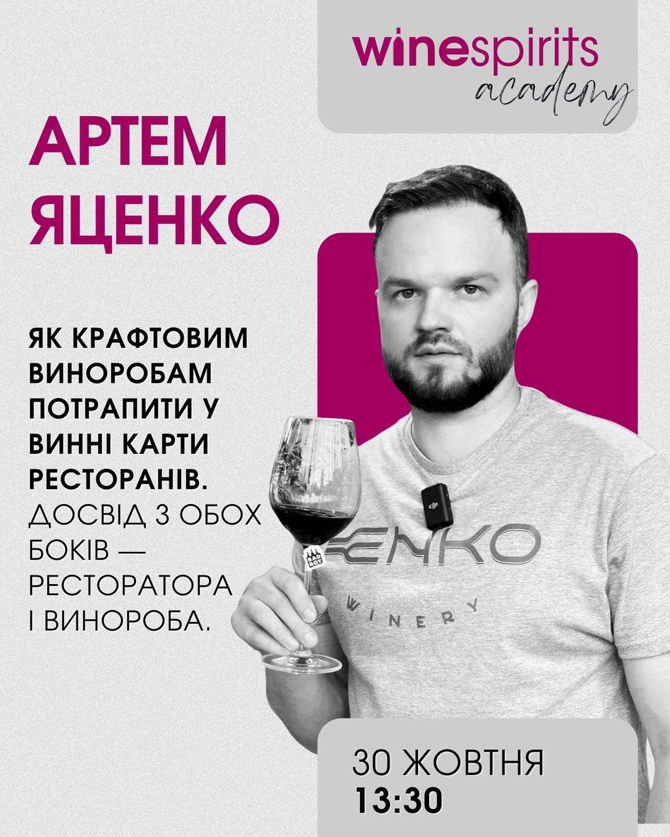 Спікер – Артем Яценко, 15 років у сфері гостинності, співвласник ресторанів Spiro та «Міф» (Львів), винороб Enko Winery (Сумщина). У програмі: Шлях еволюції як винороба – Погляд з боку ресторатора – Що потрібно, щоб ваше вино потрапило у винну карту?